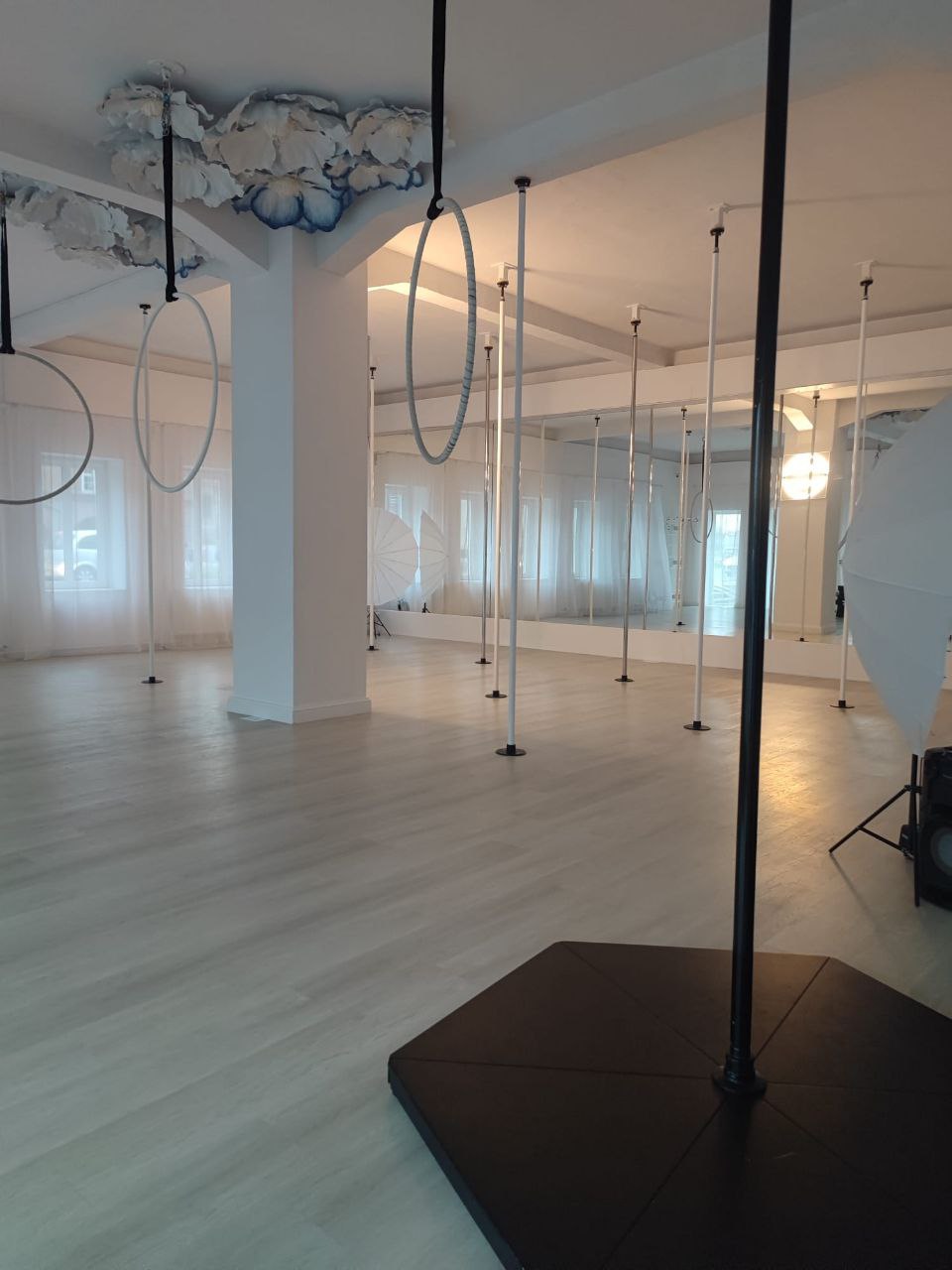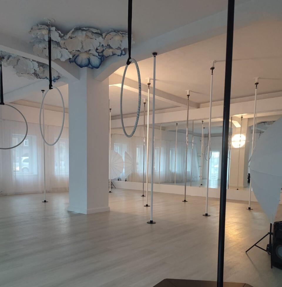 W centrum Poznania czeka na Ciebie nowoczesna przestrzeń: 10 rur (2 chromowane 45 mm, 8 malowanych proszkowo 42 mm), 7 haków do szarf i kół oraz duża, komfortowa sala. Dzięki temu każdy ma miejsce dla siebie i może ćwiczyć w pełni bezpiecznie.